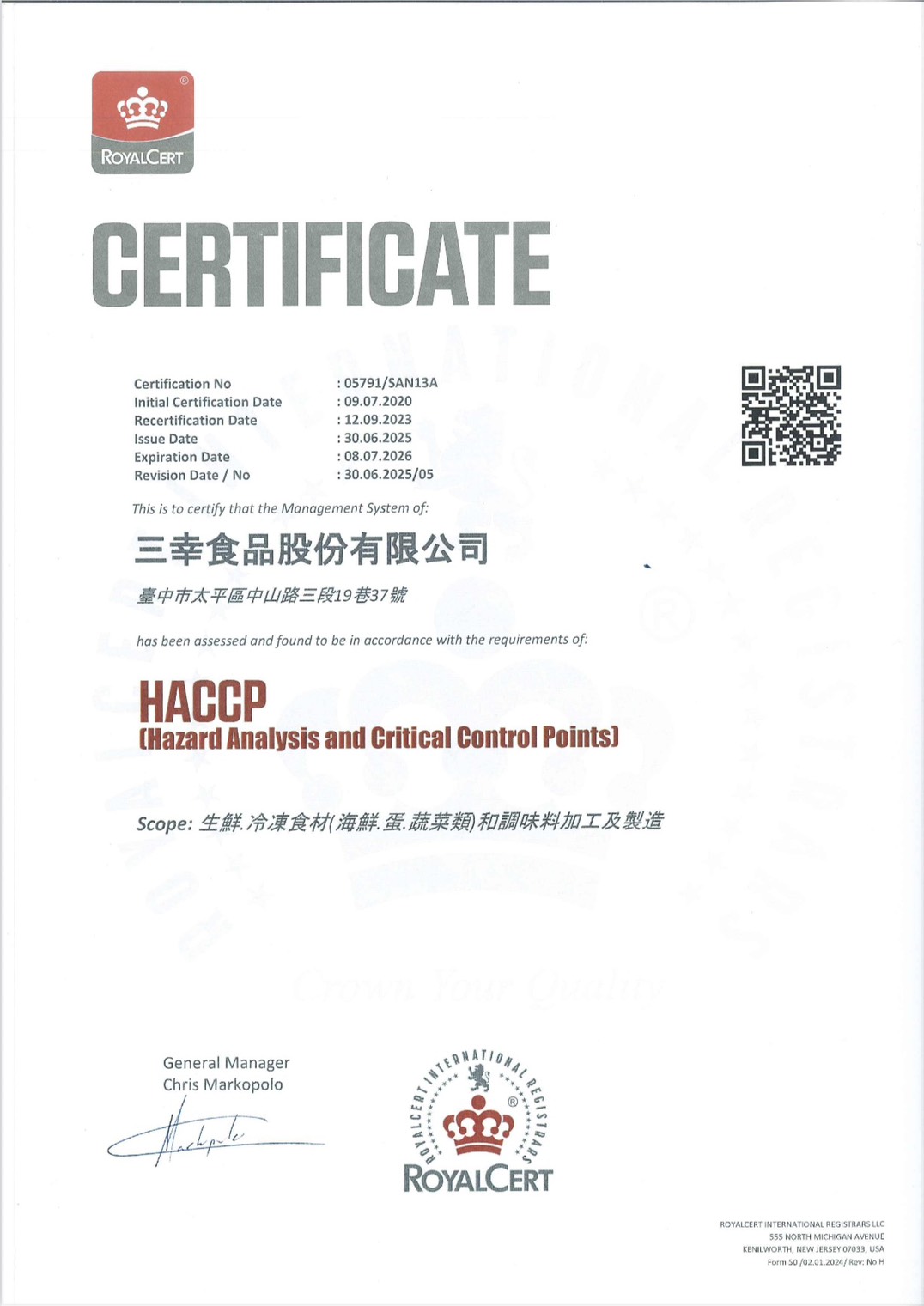 秉持永續經營、不斷突破,產業升級,逐步與國際接軌,獲得 HALALL 與 HACCP、ISO 22000、ISO 9001 食品安全管理系統驗證,並且通過多項國際認證驗證標準,並持續產品投保產品責任險,提供消費者更多層保障,讓消費者吃得健康又安心。